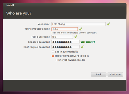 4. Distribuye tu espacio en discoUtiliza las checkbox para elegir si quieres instalar Ubuntu por encima del sistema operativo actual (yo lo hice ;)) lo cual eliminaría el sistema antiguo. O puedes elegir la opción "Something else" para hacer una distribución de tu disco duro y instalar un arranque dual que te dará la opción cuando arranques tu computadora si quieres arrancarlo con Ubuntu o con tu otro sistema operativo.