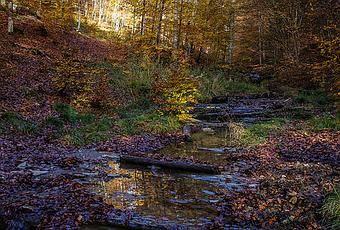 En un rincón sombrío del bosque nos encontramos con uno de los muchos arroyos que lo atraviesan. El sol está detrás nuestro.