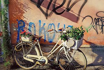 Una bicicleta con plantas por delante de unos grafitis en Roma, Italia.