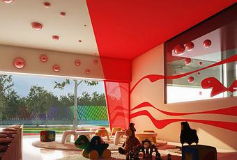 Luz y color dentro y fuera, con módulos abiertos volcados hacia el exterior. En cuanto al interior, espacios diáfanos y conectados entre ellos con cristaleras de vidrio que facilitan las labores de los profesores y clases divididas por edades con sus aseos y cunitas para los más bebes.