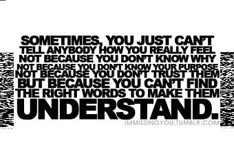 A veces, no le podés contar a nadie como te sentís, no porque no sabés por qué, no porque no sabés tu intención, no porque no confiés en ellos, sino porque no podés encontrar las palabras justas para hacerlos entenderte.Cuando queremos expresar lo que sentimos por un amigo, como lo decimos? Por la familia? Por una pareja? Por un hermano? Es muy difícil tratar de explicar lo que sentimos con palabras, y mucho más difícil es encontrar las palabras exactas para expresarnos. Por eso yo soy partidaria que para mostrar lo que sentimos no tenemos que ponernos a hablar, a trarar de explicarlo, tenemos que demostrarlo con acciones, siempre.