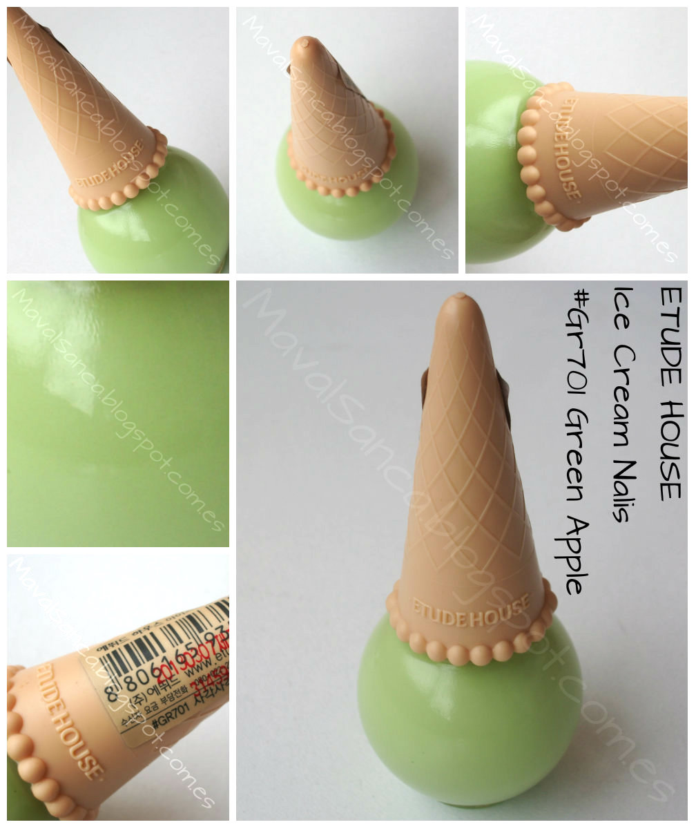 Los colores pastel son una elección perfecta para el verano. En pieles morenas estos y los neones me parece que son como los gofres con nata, una combinación perfecta. Pastel colors are a perfect choice for summer. In tanned skin, I think, pastel and neons are like waffles with whipped cream, a perfect combination.ETUDE HOUSE - Ice cream nails - GR701 Green apple.Estos esmaltes de ETUDE HOUSE, los Ice Cream Nails, son tan cucos por fuera, con su precioso bote con forma de helado, que es fácil que nada más verlos te hagan ojitos.These nail polish, ETUDE HOUSE Ice Cream Nails are as cute on the outside, with its beautiful boat witb ice cream form, it's easy to make eyes at them.