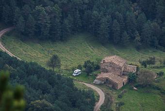 Desde las alturas podemos ver las viejas masías que hay dispersas entre los bosques.
