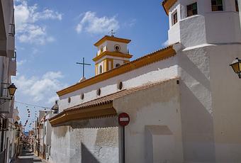 De un día para otro engalanan las calles de Carboneras para las Fiesta del Pescador en agosto.