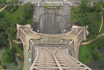 En el lugar más alto de la Torre Eiffel, donde se pueden ver las colas de gente esperando para tener la misma vista.