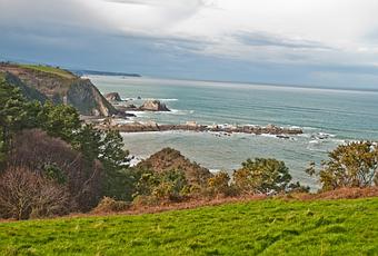 Abarcamos de una ojeada la líquida y verdosa llanura, que terminaba adornada en el borde del medio cuenco, con abundantes penachos de espuma blanca. El sonido de la mar llegaba fuerte y nítido, al sendero entre pinos –cargados de piñas- por donde transitábamos. Fuimos perdiendo altura, a través de un camino en zigzag, deteniéndonos en cada revuelta a contemplar las cambiantes visuales del pedrero, y paladear y disfrutar de las mismas. El paraje se mostraba solitario, nadie había elegido aquella zona para recoger orícios, así que pudimos sentirnos doblemente recompensados, visual y espiritualmente, acunados por tanta y tan honda paz.
