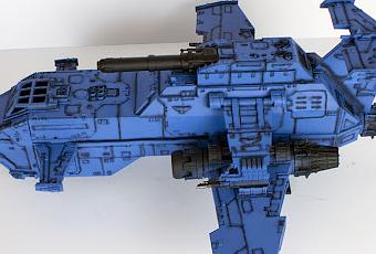 To break up the blue I'm planning on masking off and airbrushing on a diagonal white line on the side of the craft. I will also stencil on some large Ultramarine U symbols on the main wings and the nose below the front of the cockpit. I will also do a skull and lightning bolt motif freehand above the front wings. Heavy bolters are mounted on the side of the nose so that's a no go area for freehand.