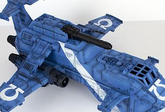 In this update you can see I've added a diagonal stripe to either side of the hull and three large Ultramarine symbols, two on the wings and one on the nose. All of these elements have been added to help break up the massive amount of blue and I think it really works. More pics after the jump.